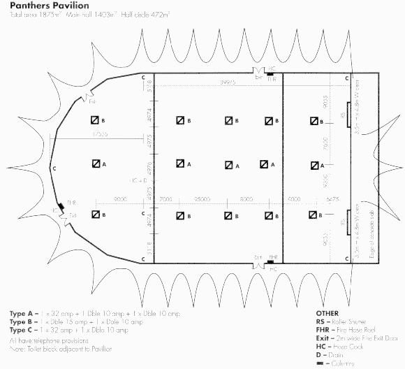 | The floorspace covers an area of 1875 square metres and can be divided with the use of a theatrical curtain across the support beams. The exhibition pavilion is fully air-conditioned. Single and three phase power is available within the floor, as well as phone and fax points. Exhibitor access is enhanced with the inclusion of two large access doors located at the rear of the building, making it easy to assemble large scale stands with heavy equipment. Free outdoor parking for 500 cars is available directly in front of the building, and additional parking for 1500 cars is available closer to the club. The grounds surrounding the Exhibition Pavilion are level and turfed, and available to erect temporary structures or to be used for field displays. | |